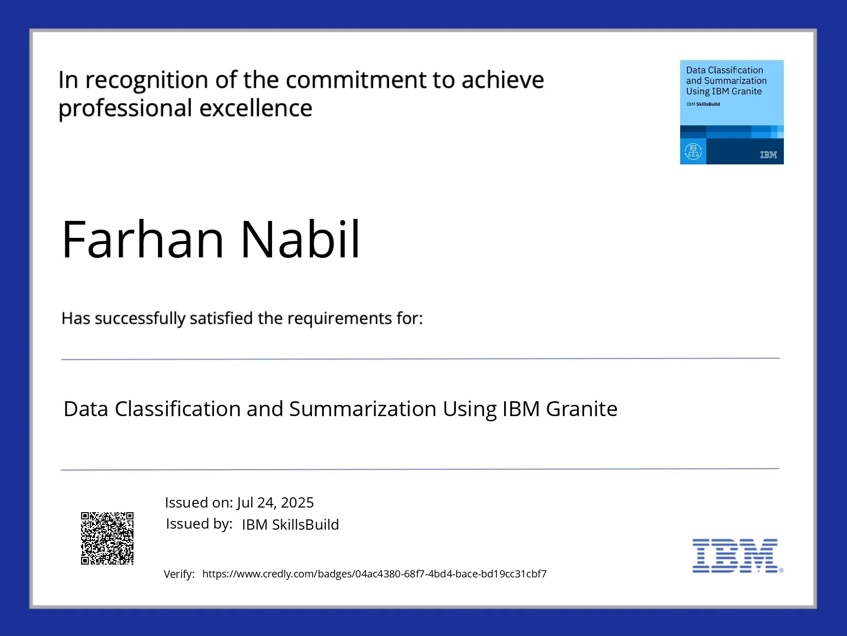 A certification for expertise in data classification and summarization using IBM Granite, awarded by IBM SkillsBuild.